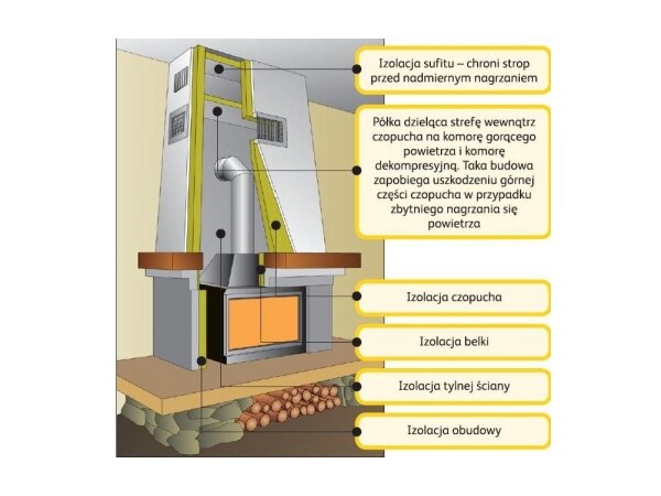 Kominki z wymuszonym obiegiem izolujemy zaczynając od dystrybutora gorącego powietrza, którego odpowiednie ocieplanie zabezpiecza przed stratami ciepła i nadmiernym nagrzaniem obudowy. Płyty izolacyjne powinny być umieszczone w odległości minimum 5 centymetrów od wkładu, folią skierowaną do wkładu kominkowego. Do montażu płyt używajmy profili zapewniających ich ciasne osadowienie.