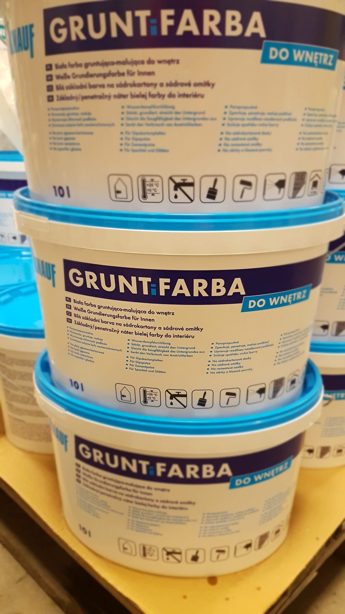 Knauf Grunt i Farba to produkt gruntująco-malujący w jednym. Idealnie nadaje się do przygotowania powierzchni ścian i sufitów przed ostatecznym położeniem koloru. Knauf Grunt i Farba jednocześnie gruntuje podłoże oraz nadaje mu biały kolor, który stanowić będzie doskonałą bazą pod farby nawierzchniowe. Za pomocą Knauf GRUNTiFARBA możliwe jest jednoczesne zagruntowanie i pomalowanie powierzchni ścian i sufitów wewnątrz pomieszczeń, wykonanych z płyt gipsowo kartonowychtynków gipsowychcementowych i cementowo wapiennych, a także szpachli oraz gładzi. Dzięki farbie można poprawnie przygotować powierzchnię ścian i sufitów, a stworzona za jej pomocą powłoka stanowić będzie doskonałą bazę pod farby nawierzchniowe, występujące w wielu odmianach i kolorach. Produkt jest zgodny z systemami tynkarskimi Knauf, dzięki czemu nadaje się do użycia z każdym naszym tynkiem.