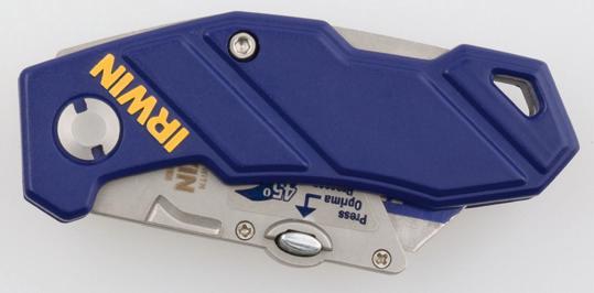 Wysokiej jakości nóż składany IRWIN posiada system szybkiej wymiany ostrza pod katem 45˚, co wpływa na bezpieczeństwo pracy. Dodatkowo posiada on użyteczny zaczep do paska oraz ostrze Bi-Metal. Po złożeniu zajmuje niewiele miejsca, co z pewnością jest jego głównym atutem.