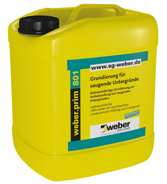 Warstwa gruntująca i pielęgnacyjna z weber.prim 801 po wyschnięciu jest przezroczysta i służy do stabilizacji pylących i chłonnych podłoży. weber.prim 801 stosowany jest do gruntowania tynku, jastrychu cementowego i anhydrytowego, płyt gipsowych, gazobetonu, płyt z cementu włóknistego, celem uszczelnienia plam po wodzie, nikotynie i oleju (zapobieganie przebijania tych plam).